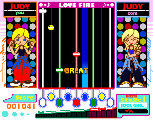 | Bei Pop´n Music muss man nicht nur 4 Richtungen wie bei DDR beachten, hier sind es ganze 9 Linien, auf denen die verschiedenfarbigen Buttons herunterscrollen und zur rechten Zeit gedrückt werden müssen. |